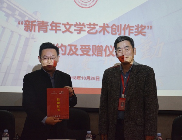 仪式伊始,熊剑峰简要介绍了捐赠方梁振华及其所设立“新青年文学艺术创作奖”的情况。梁振华与学院院长郑贤章签订捐赠协议,黎大志代表学校接受了捐赠支票,并为梁振华颁发捐赠证书。