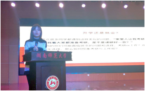 最后,周子杨用毕业时间轴向同学们罗列毕业前不同时期的具体任务。她呼吁大家重视毕业论文撰写,合理规划时间。号召大家踊跃参与12月7日、8日学校将举行的两场大型招聘会。